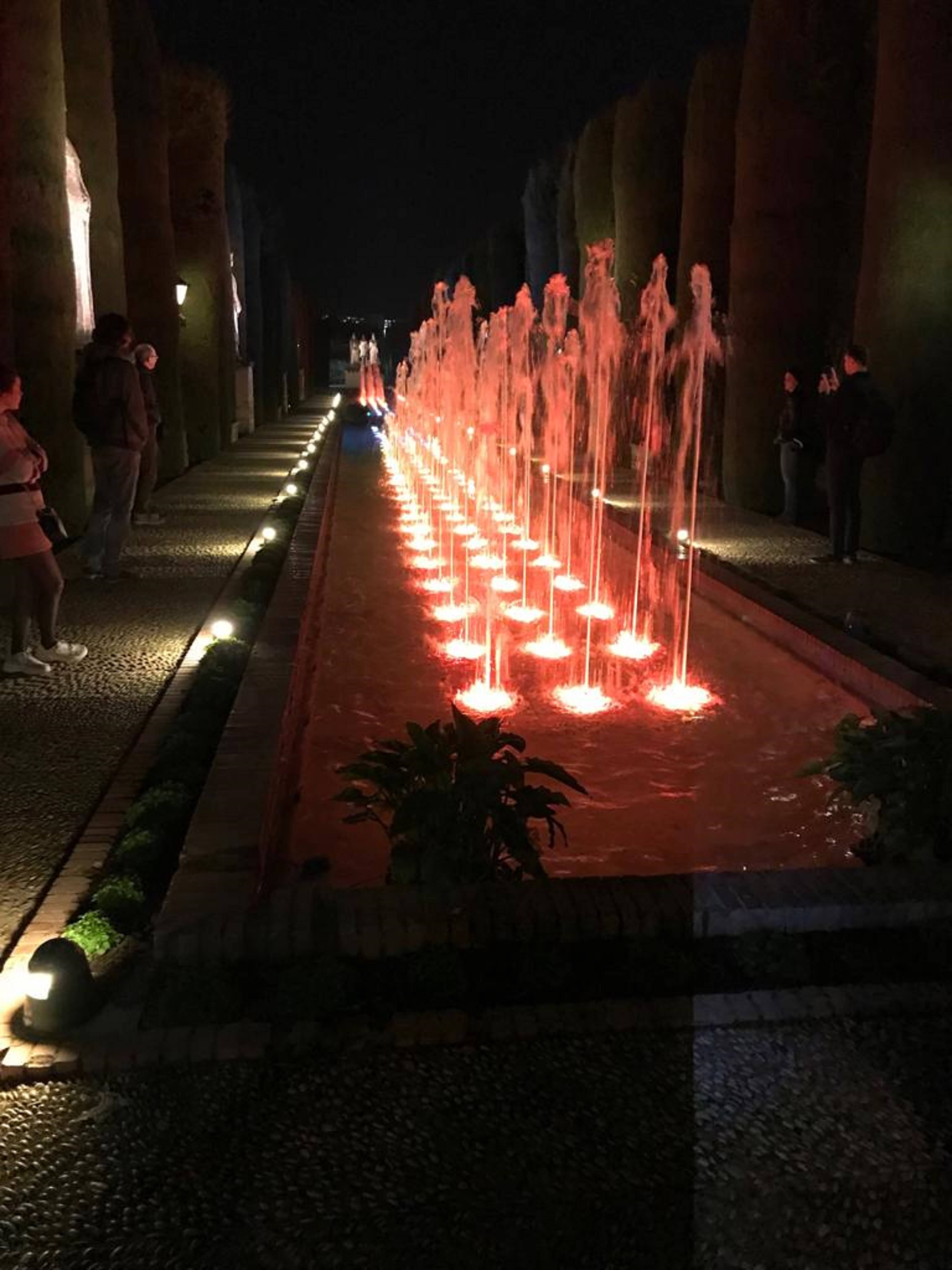 Heute, Jahrhunderte später, murmelt in den magischen Nächten des Alkazar noch immer das Wasser der Brunnen in den Gärten, das Mondlicht spiegelt sich in den Teichen, die Blumen verströmen einen betörenden Duft. Beim Eintritt in das wunderbare Gartengelände beginnt eine Reise durch die Geschichte von Córdoba. Die Dunkelheit schafft ein Klima der Ruhe. Ein Video in einem Patio thematisiert das Wasser als Teil der Geschichte von Córdoba. Danach beginnt der Spaziergang durch die Gärten, bei dem das Schauspiel von Wasser und Licht die Sinne verführt. Die Musik und der Rhythmus des Wassers erinnern an eine feudale Burgfeier, die von den Katholischen Königen selbst ausgerichtet worden sein könnte. Eine zweite Wassershow verstärkt den Eindruck, einem spektakulären und einzigartigem Erlebnis beizuwohnen.