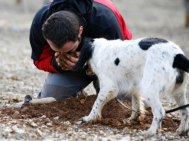 Wenn ein trainierter Hund eine Trüffel findet, bleibt er stehen, schnüffelt am Boden, kratzt ein wenig mit den Vorderpfoten und wartet schwanzwedelnd darauf, dass sein Herrchen oder Frauchen ihn für das Auffinden der Fundstelle belohnt. Der Trüffeljäger gräbt dann die Trüffel vorsichtig aus, nachdem er sie zuvor mit einer Machete in Form eines steifen Dolches ertastet hat, lässt das Tier daran riechen und belohnt es entsprechend.