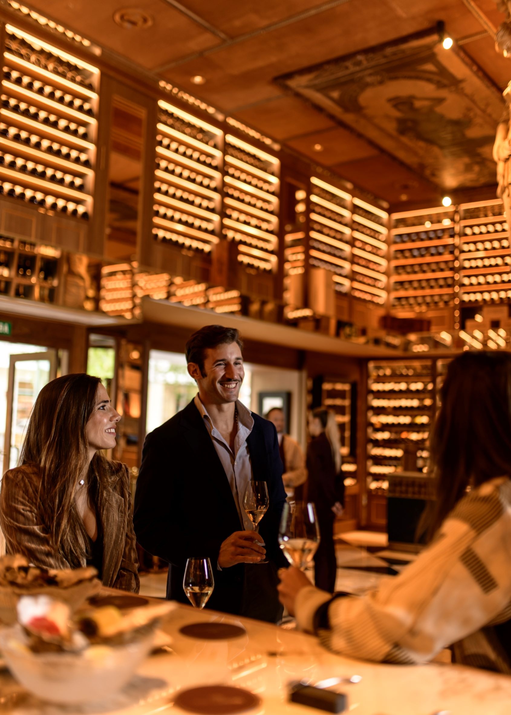 Im Erdgeschoss vereinen sich gastronomische Eleganz und exquisiter Vintage-Look. Die Bar im Eingangsbereich wurde als geselliger Raum konzipiert, in dem man Wein genießen kann, begleitet von einer Auswahl an Delikatessen wie iberischem Fleisch, feinen spanischen Konserven, handwerklich hergestellten Käsesorten und international bekannter Gänseleber. Die Sommeliers haben eine glasweise Weinkarte mit etwa 8' Referenzen zusammengestellt, und wer lieber eine Flasche entkorkt, kann aus mehr als 3.000 Referenzen wählen.